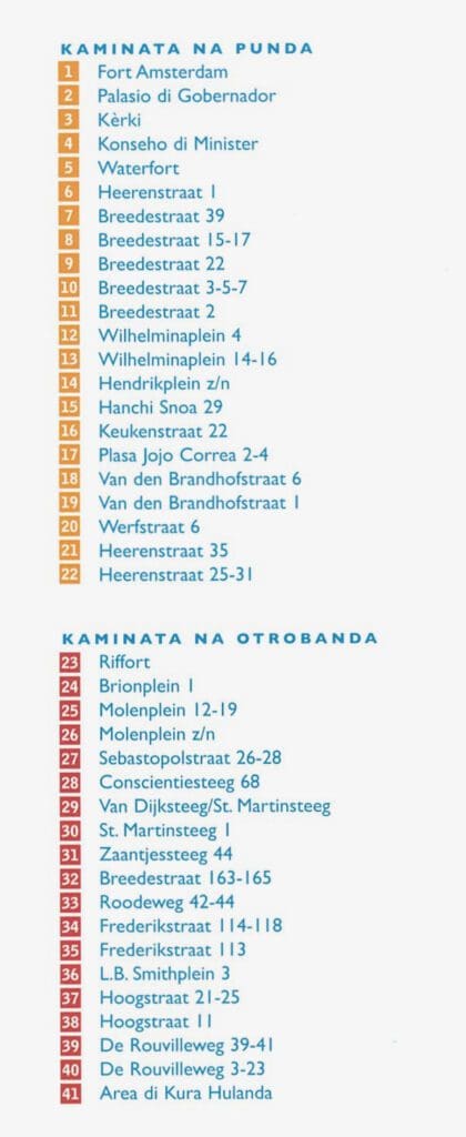 Eksperensiá e siudat históriko riba bo mes, kanando den sentro di siudat ku e guia di arkitektura akí. Den dje lo bo haña un kaminata pa ost i unu pa wèst, tur dos kuminsando na Bahia di Santa Ana serka di e brùg di ponton Reina Emma. E kaminata pa parti ost lo laga bo pasa den e parti mas bieu di Willemstad, awendia yamá Punda, i den un parti chikí di e bario di Skaló. E ruta akí tin un largura di mas o ménos 2,75 kilometer. E kaminata pa parti wèst ta guia bo den e distrito di Otrobanda, na e otro banda di Bahia di Santa Ana. E ruta akí tin un largura di mas o ménos 3,25 kilometer.