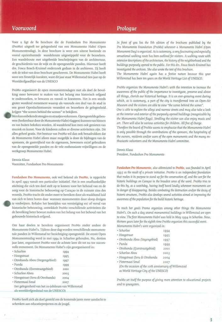 Papiamentu – Esaki ta e di ocho foyeto ku e Fundashon Pro Monumento ta publiká na okashon di un Monumento Habrí (Open Monumentendag). E foyeto aki ta kontené un ruta pa bishitantenan kana ku ta masha interesante i sobretodo spektakular. Un ruta ku deskripshon ekstendo di arkitektura, historia di e bario i e edifisionan habrí. Pa esaki drs. Fosca Bosch-Kruimel a hasi investigashon den archivonan. Alabes el a skirbi e teksto di e foyeto aki. Monumento Habrí atrobe tin un karakter festivo ya ku e aña aki Willemstad ta hasi dies aña riba e lista di Patrimonio Mundial di UNESCO