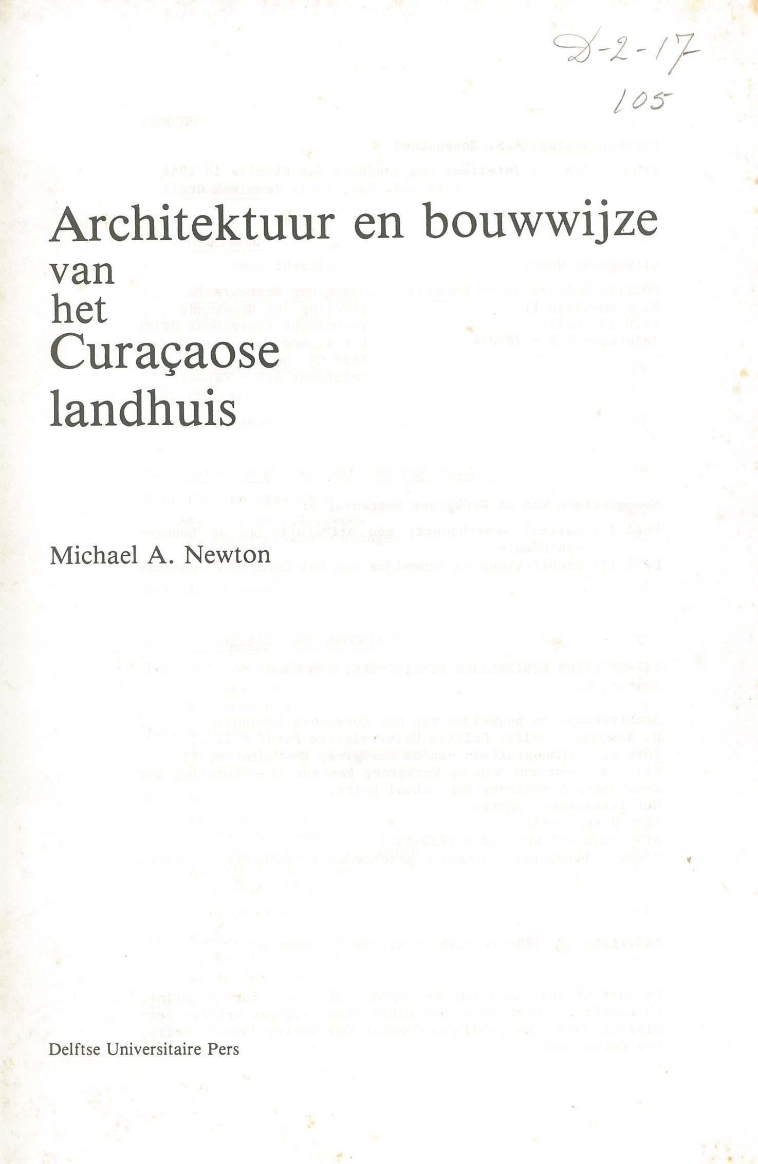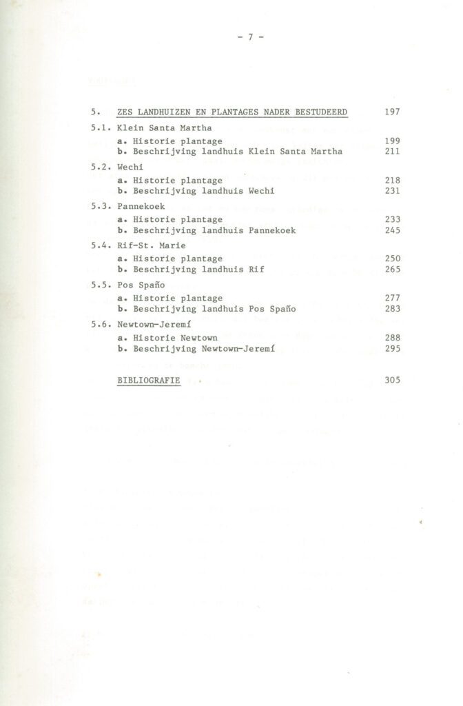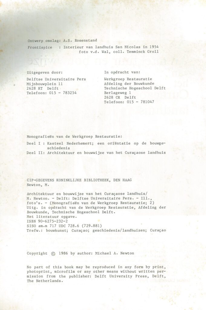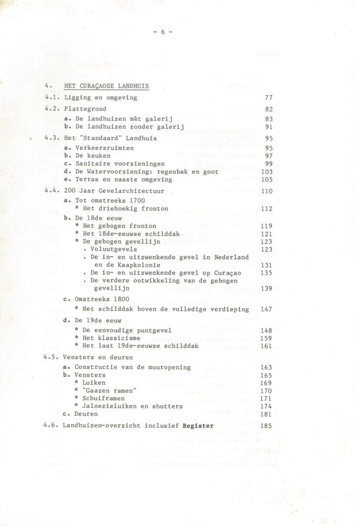 Zowel de plattegronden als de gevels van deze voormalige plantagewoningen zijn hierbij systematisch ingedeeld in een reeks typen. In een overzicht van alle nog bestaande landhuizen op het eiland wordt daarna van het merendeel aangegeven onder welk plattegronden geveltype ze zijn te rangschikken. Tot slot worden 6 landhuizen, die door de auteur in het kader van een onderzoek aan de Technische Hogeschool Delft op Curaçao werden opgemeten, uitvoerig beschreven.
