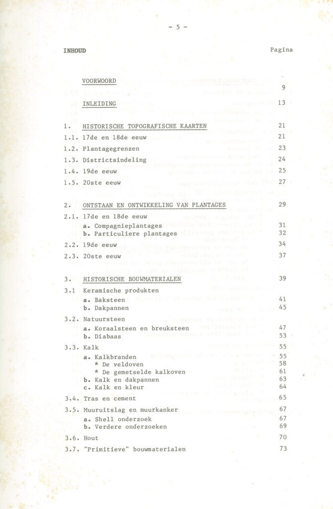 Alle bouwmaterialen, zowel lokale als geïmporteerde, die vroeger op het eiland werden toegepast, worden in deze studie behandeld. Aan de hand van een groot aantal voorbeelden wordt vervolgens een gedetailleerd beeld gegeven van de architektuurontwikkeling van het Curaçaose landhuis vanaf omstreeks 1700 tot 1900.