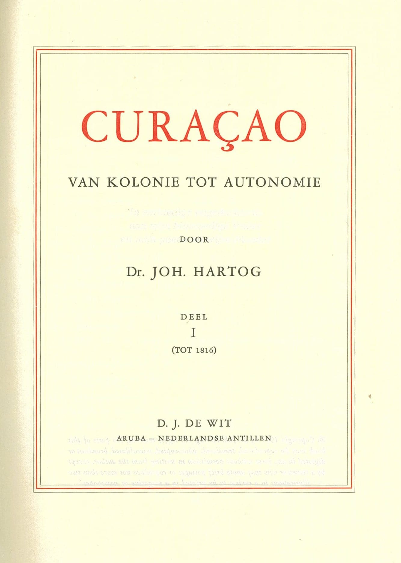 Een beschrijving van de geschiedenis van Curaçao tot 1816. Dit boek is onderdeel van de reeks van Dr. Joh. Hartog over de geschiedenis van I Aruba, II Bonaire III Curaçao en IV de Bovenwindse eilanden. Curaçao bestaat uit twee delen, waarvan dit het eerste deel is.