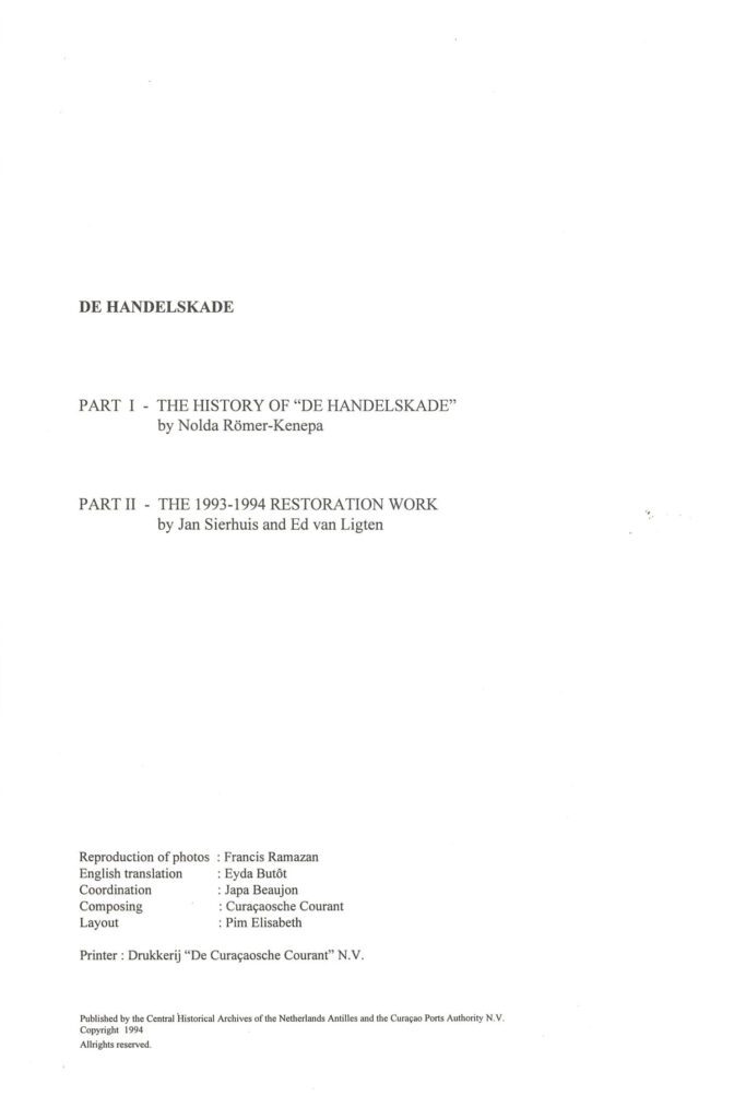 ‘De Handelskade: De Kaai van den Waterkant’ (1994), geschreven door Nolda Römer-Kenepa, Jan Sierhuis en Ed van Ligten, is een historische en culturele verkenning van de iconische Handelskade in Willemstad, Curaçao. Dit boek is onderdeel van de Lantèrnu-reeks (nr. 14) en onderzoekt de architectonische, economische en sociale betekenis van de beroemde waterkant langs de Annabaai. De auteurs beschrijven hoe de Handelskade zich door de eeuwen heen heeft ontwikkeld, van handelscentrum in de koloniale tijd tot een herkenbaar symbool van Curaçaos erfgoed. Naast historische achtergronden bevat het boek illustraties en beschrijvingen van de karakteristieke gebouwen, evenals inzichten in de mensen en bedrijven die hier gevestigd waren. De publicatie biedt een waardevolle bron voor liefhebbers van architectuur, maritieme geschiedenis en cultureel erfgoed.