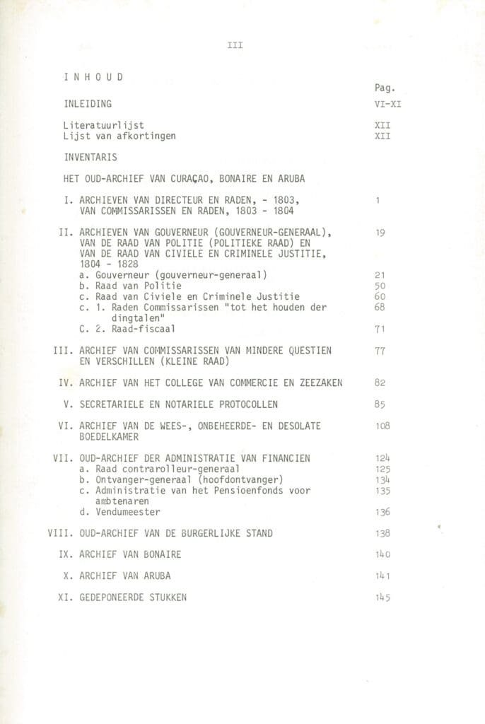De oud-archieven van Curaçao, Bonaire en Aruba (1707-1828) bevatten stukken van een groot aantal instellingen op bestuurlijk terrein (politiek, juridisch, militair, religie) van deze eilanden. Tot de stukken behoren reeksen resoluties, notulen, rekesten met daarop genomen beslissingen en ook gerechtsrollen (met sententies). Verder zijn er journalen van gouverneurs en commandeurs, reglementen en instructies en aanstellingen van ambtenaren. Ook is er veel correspondentie, met name in de vorm van uitgaande brieven. Voor financiële instellingen als de weeskamer zijn er onder meer grootboeken, kasboeken, venduboeken en boedels. Van religieuze instellingen zijn er gegevens over dopen-, trouwen- en begraven. Er zijn protocollen van secretariële en notariële akten en akten van hypotheek. Het archief bevat ook vrijbrieven (manumissies) betreffende het officieel vrijkopen of vrijgeven van slaven. Tevens zijn er de nodige gegevens over de lokale scheepvaart (inclusief de kaapvaart): handel, stranding, passagiers, desertie e.d. Er zijn diverse eigentijdse toegangen als registers en repertoria.