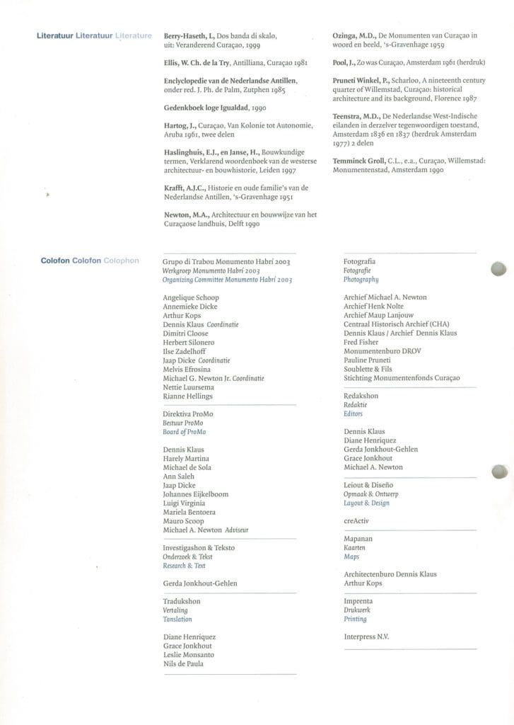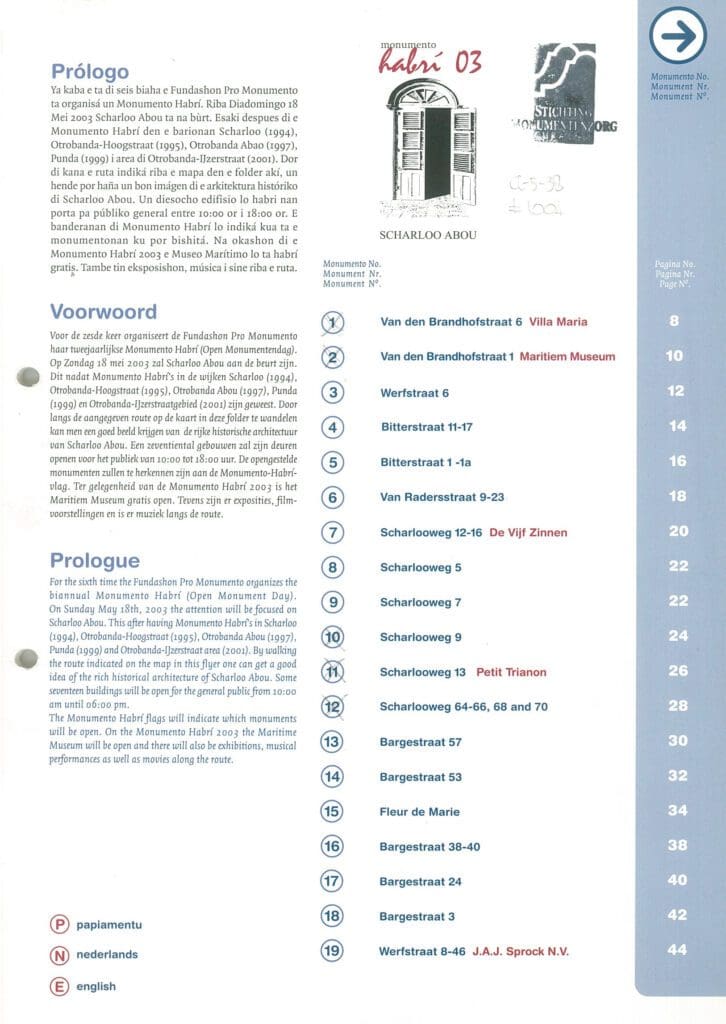 Nederlands – Voor de zesde keer organiseert de Fundashon Pro Monumento haar tweejaarlijkse Monumento Habrí (open Monunumentendag). Op zondag 18 mei 2003 zal Scharloo Abou aan de beurt zijn. Dit nadat Monumento Habrí’s in de wijken Scharloo (1994), Otrobanda- Hoogstraat (1995), Otrobanda Abao (1997), Punda (1999) en Otrobanda- Ijzerstraatgebied (2001) zijn geweest. Door langs de aangegeven route op de kaart in deze folder te wandelen kan men een goed beeld krijgen van de rijke historische architectuur van Scharloo Abou. Een zeventiental gebouwen zal zijn deuren openen voor het publiek van 10:00 tot 18:00 uur. De opengestelde monumenten zullen te herkennen zijn aan de Monumento Habrí vlag. Ter gelegenheid van de Monumento Habrí 2003 is het Maritiem Museum gratis open. Tevens zijn er exposities, filmvoorstellingen en is er muziek langs de route.