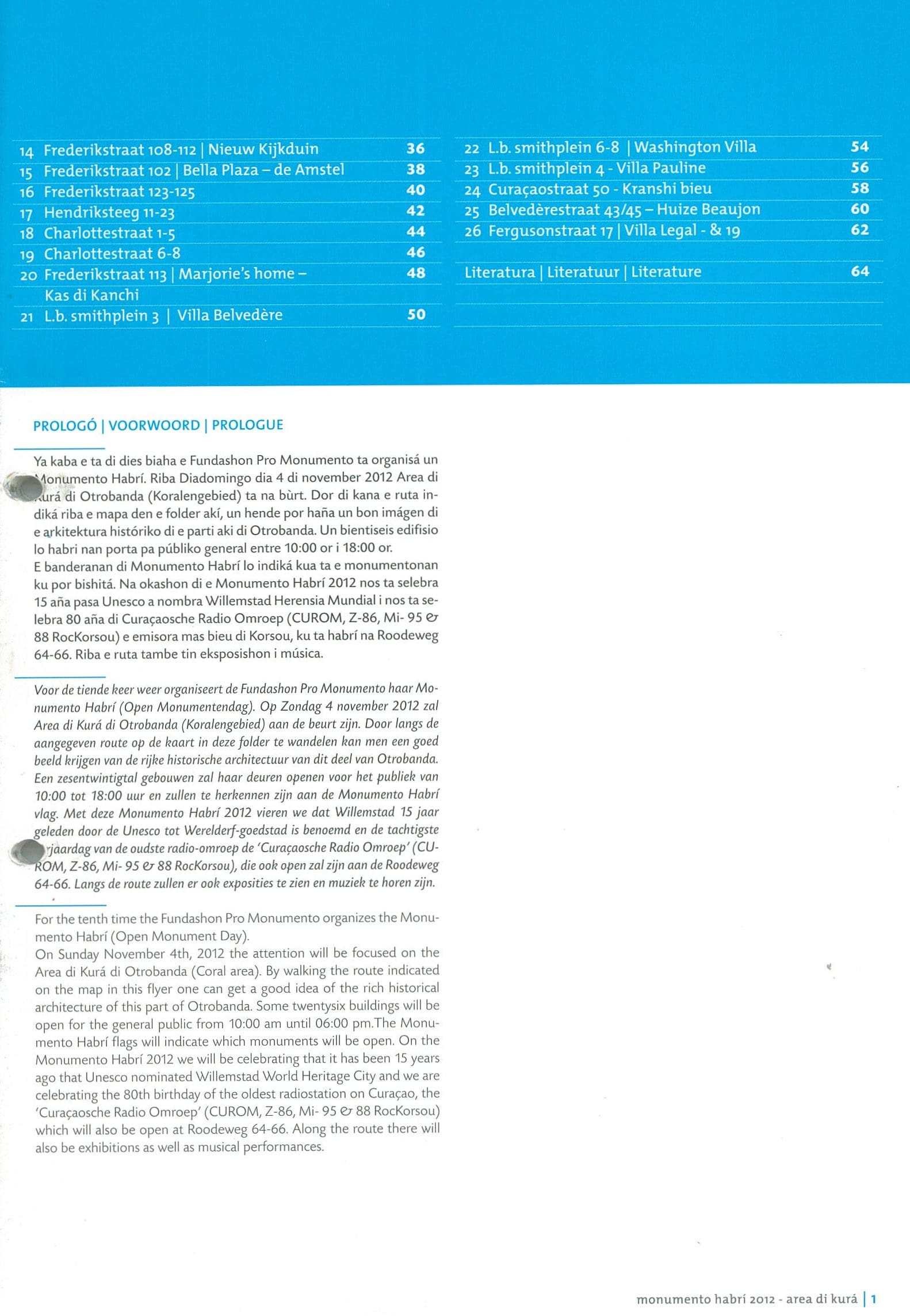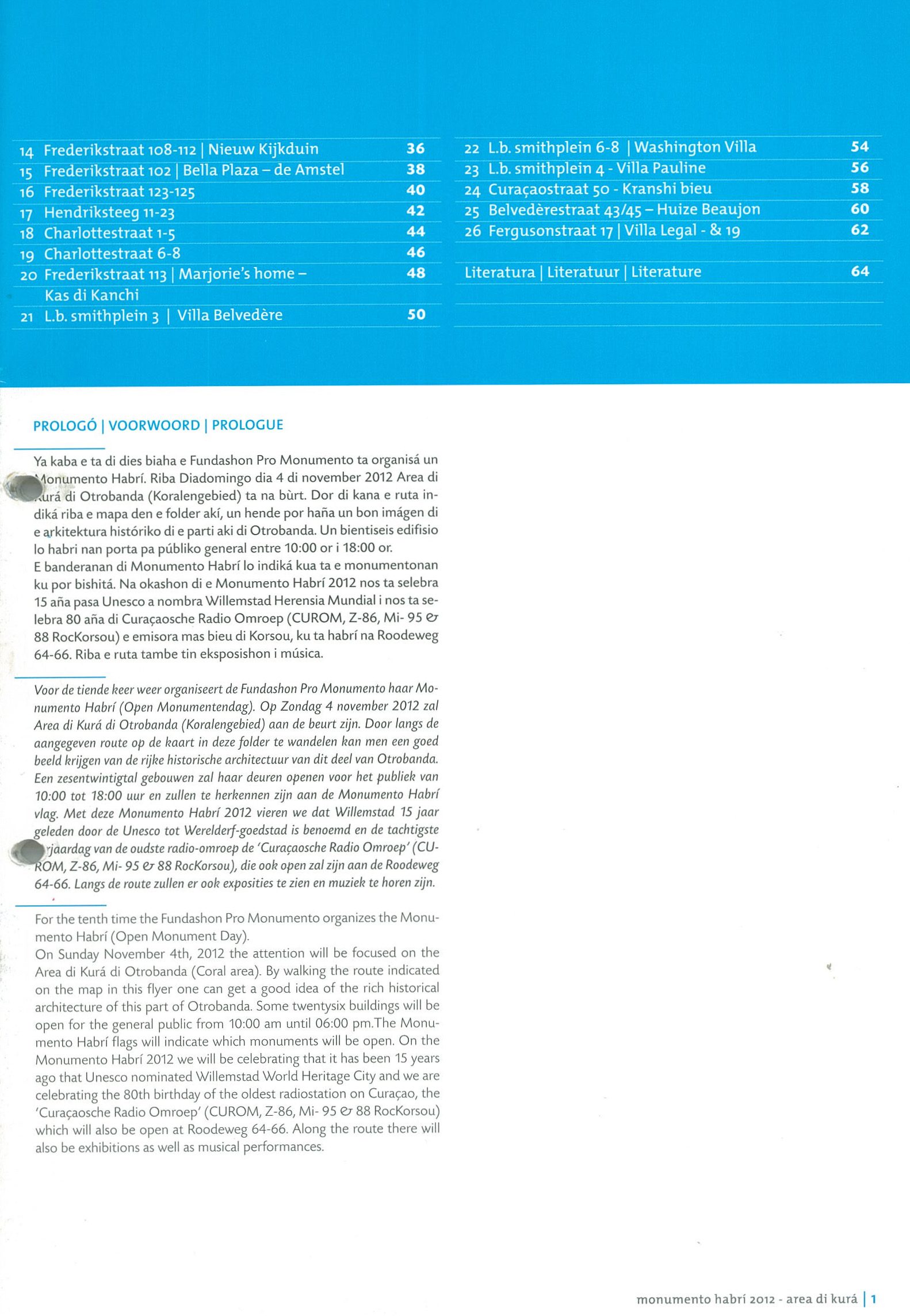 Papiamentu – Ya kaba e ta di dies biaha e Fundashon Pro Monumento ta organisá un Monumento Habrí. Riba Diadomingo die 4 di november 2012 Area di Kurá di Otrobanda (Koralengebied) ta na bùrt. Dor di kana e ruta indiká riba e mapa den e folder akí, un hende por haña un bon imagen die e arkitektura históriko di e parti aki di Otrobanda. Un bientiseis edifisio lo habri nan porta pa públiko general entre 10:00 or i 18:00 or. E banderanan di Monumento Habrí lo indiká kua ta e monumentonan ku por bishitá. No okashon di e Monumento Habrí 2012 nos ta selebra 15 aña pasa Unesco a nombra Willemstad Herensia Mundial i nos ta selebra 80 aña di Curaçaosche Radio Omroep, e emisora mas bieu di Korsou, ku ta habrí na Roodeweg 64-66. Riba e ruta tambe tin eksposishon i música.