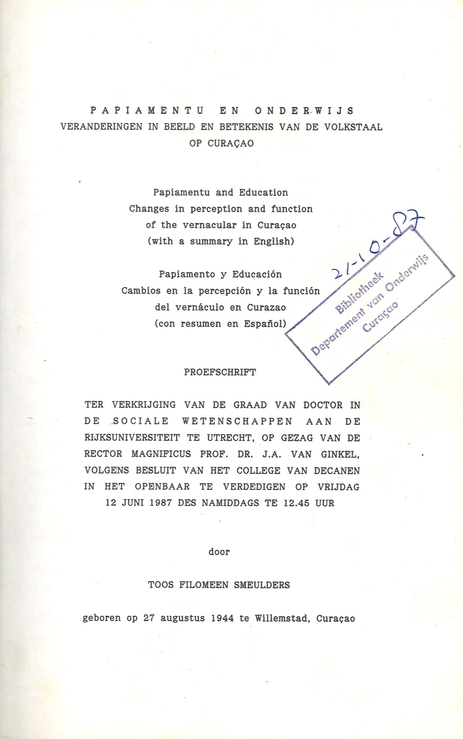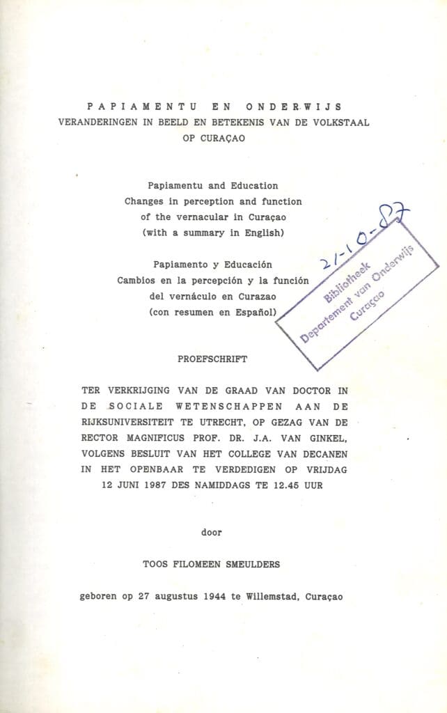 Het boek ‘Papiamentu en onderwijs: Veranderingen in beeld en betekenis van de volkstaal op Curaçao’ (1987) is het proefschrift van Toos F. Smeulders, waarin zij de veranderende status en perceptie van het Papiamentu in het onderwijs op Curaçao onderzoekt.
