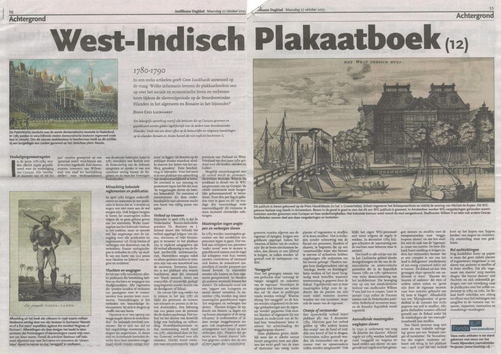 In een reeks artikelen geeft Cees Luckhardt antwoord op de vraag ‘Welke informatie leveren de plakkaatboeken ons op over het sociale leven en rechtssysteem tijdens de slavernijperiode op de Benedenwindse Eilanden in het algemeen en op Bonaire in het bijzonder. Een plakaatboek is een historisch boek waarin alle officiële wetten, plakkaten, verordeningen en besluiten van een bepaald bestuur worden gebundeld en gepubliceerd.