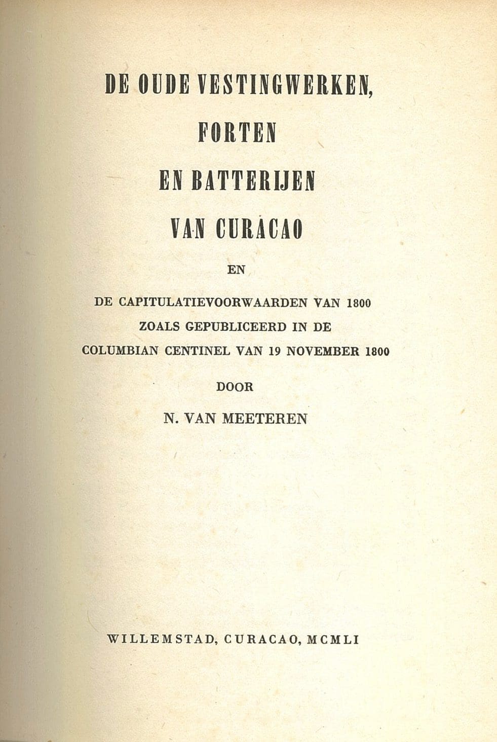 “De Oude Vestingwerken, Forten en Batterijen van Curaçao” is een boek geschreven door N. van Meeteren, gepubliceerd in 1951 in Willemstad, Curaçao. Het boek biedt een uitgebreid overzicht van de historische verdedigingswerken op het eiland, waaronder forten en batterijen. Het bevat tevens de capitulatievoorwaarden van 1800, zoals gepubliceerd in de Columbian Centinel van 19 november 1800. Met 117 pagina’s en geïllustreerd met afbeeldingen en kaarten, is dit werk een waardevolle bron voor iedereen die geïnteresseerd is in de militaire geschiedenis en architectuur van Curaçao.