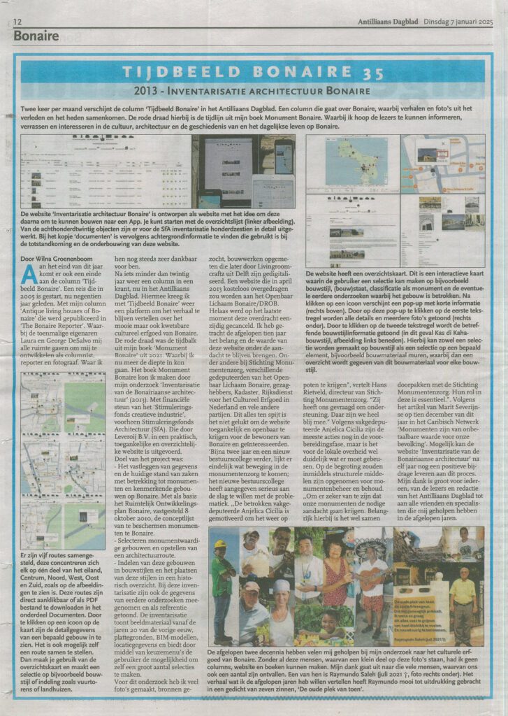 In 2013, Inventarisatie Architectuur Bonaire schrijft Wilna Groeneboom over de website die ze heeft opgezet, op basis van haar onderzoek ‘Inventarisatie van de Bonairiaanse Architectuur’. Op basis van dit onderzoek heeft ze haar boek ‘Monument Bonaire’ gemaakt. Wilna schrijft over de waarde van dit project en de uitdagingen die ze is tegen gekomen om de website toegankelijk te krijgen voor bewoners van Bonaire en geïnteresseerden.