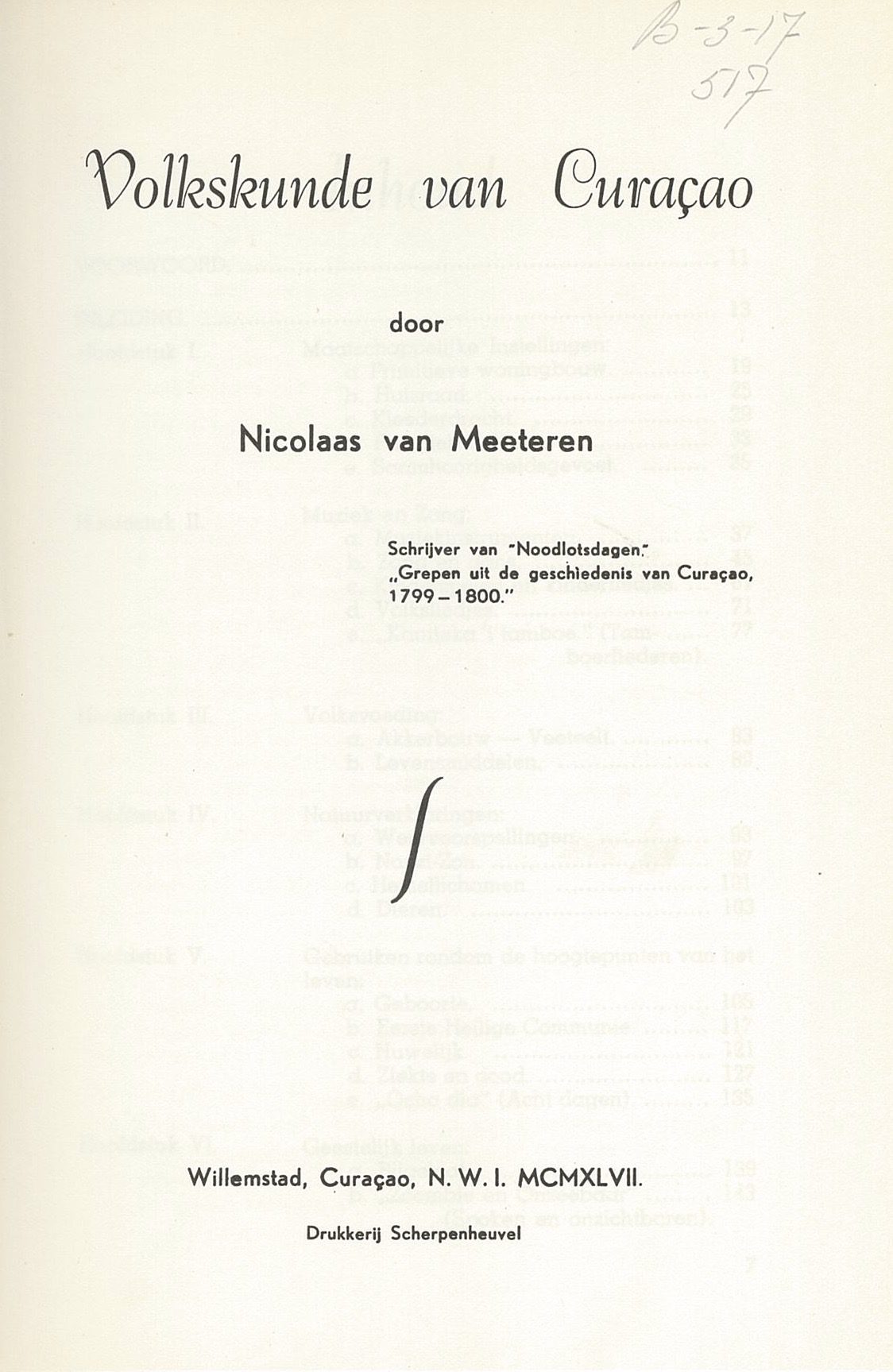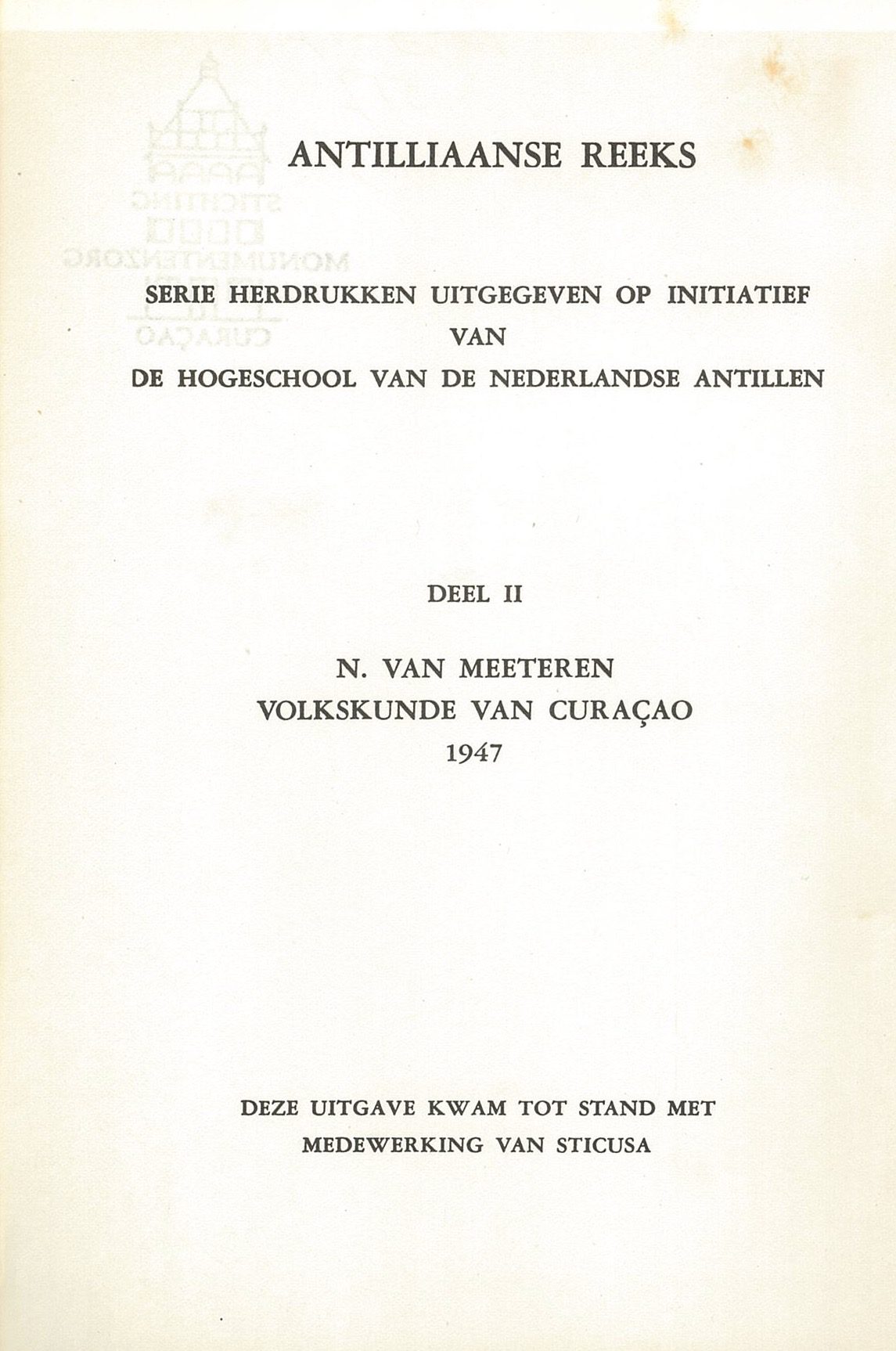 ‘Volkskunde van Curaçao’ is een invloedrijk werk van N. van Meeteren, oorspronkelijk gepubliceerd in 1947 en later herdrukt in 1977. Het boek biedt een uitgebreide studie van de volkscultuur op Curaçao, met aandacht voor etnologie en folklore. Van Meeteren documenteert diverse aspecten van het dagelijks leven, waaronder traditionele gebruiken, bijgeloof, muziek, dans en sociale structuren binnen de Curaçaose gemeenschap.