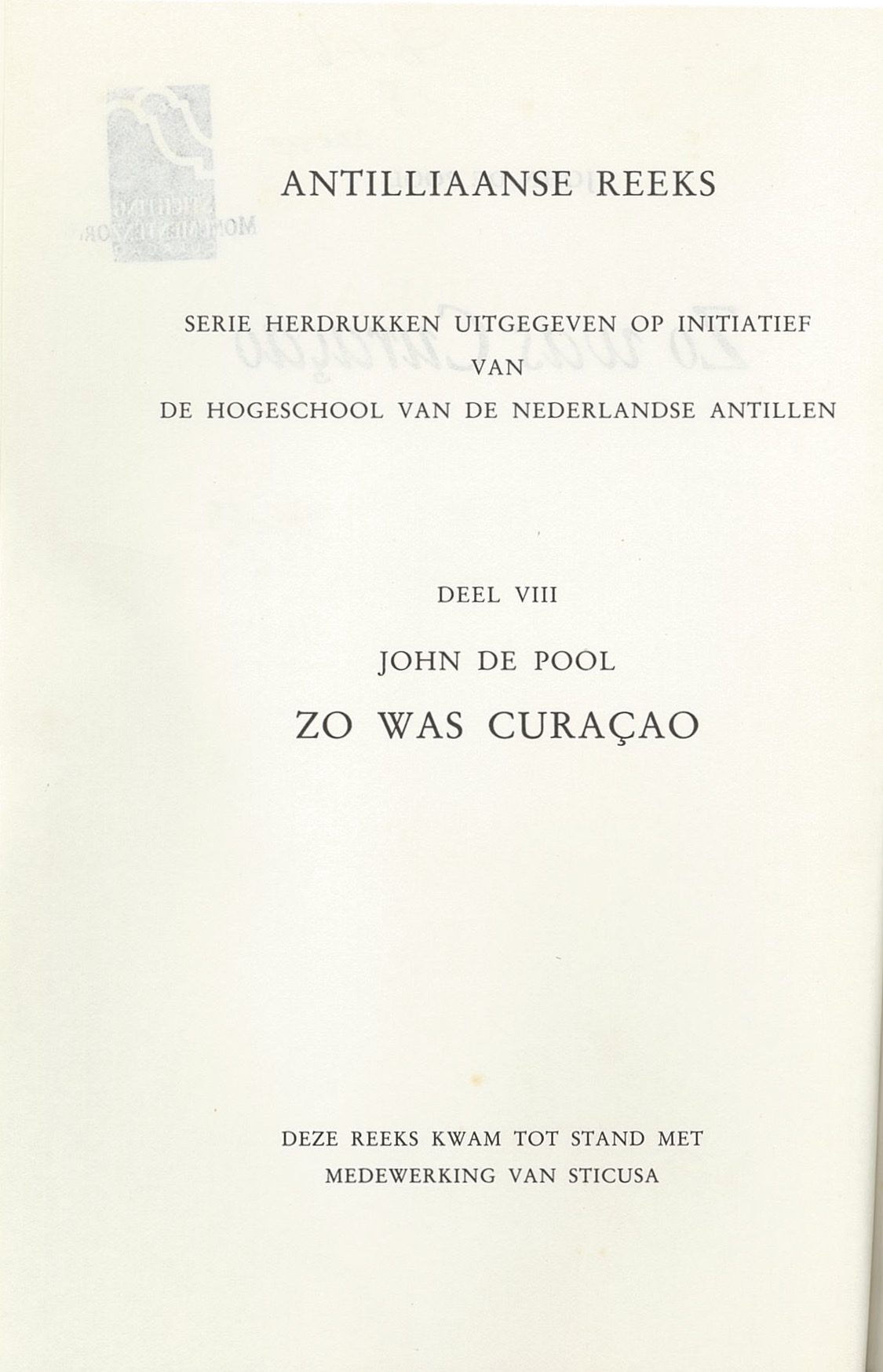 ‘Zo was Curaçao’ is een nostalgisch werk van John de Pool dat een beeld schetst van het dagelijks leven op Curaçao in de late 19e eeuw. Oorspronkelijk gepubliceerd in 1935 onder de titel Del Curaçao que se va, werd het boek in 1960 herdrukt en in 1985 uitgebracht als een uitgebreide herdruk.
