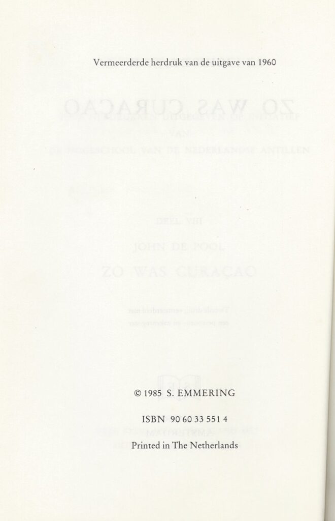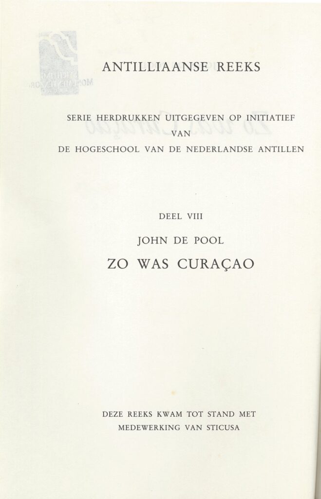 ‘Zo was Curaçao’ is een nostalgisch werk van John de Pool dat een beeld schetst van het dagelijks leven op Curaçao in de late 19e eeuw. Oorspronkelijk gepubliceerd in 1935 onder de titel Del Curaçao que se va, werd het boek in 1960 herdrukt en in 1985 uitgebracht als een uitgebreide herdruk.
