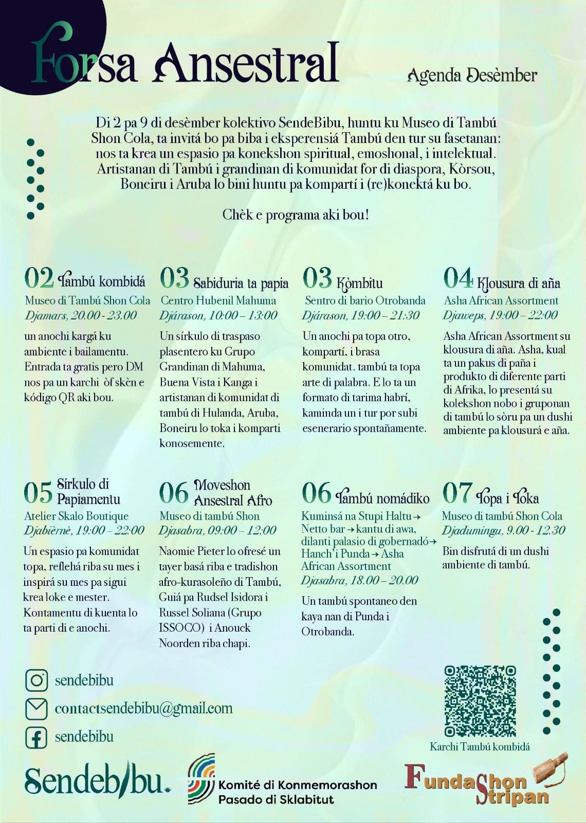 SendeBibu is a community-led collective. From December 2 to 9 we focus on dialogue, decolonization, and community service, with workshops and sessions to share and connect different generations. In the evenings we bring the culture into motion, with tambú gatherings, public moments, and circles that invite family and friends to come dance and enjoy our beloved tambú.
