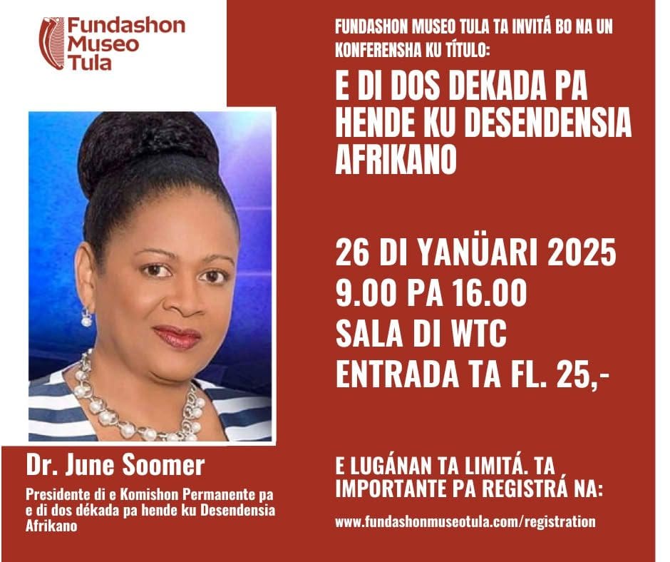De Verenigde Naties sloten het eerste decennium voor mensen van Afrikaanse afkomst in december 2024 af. Nu moet er een programma worden opgesteld voor het nieuwe decennium onder toezicht van de Verenigde Naties. Het is belangrijk dat u en uw organisatie ook deel uitmaken van de verkenning hoe we samen een decolonisatieprogramma kunnen creëren voor ons hier op Curaçao. Dit zal de eerste conferentie zijn van een reeks van drie. Stichting Museo Tula voelt zich vereerd met het bezoek van dr. June Soomer, voorzitter van de Permanente Commissie voor het Tweede Decennium voor Mensen van Afrikaanse Afkomst. Dr. Soomer, voormalig ambassadeur van St. Lucia bij Caricom, zal de hoofdspreker zijn en de kaders schetsen zodat wij ons eigen programma kunnen ontwikkelen.