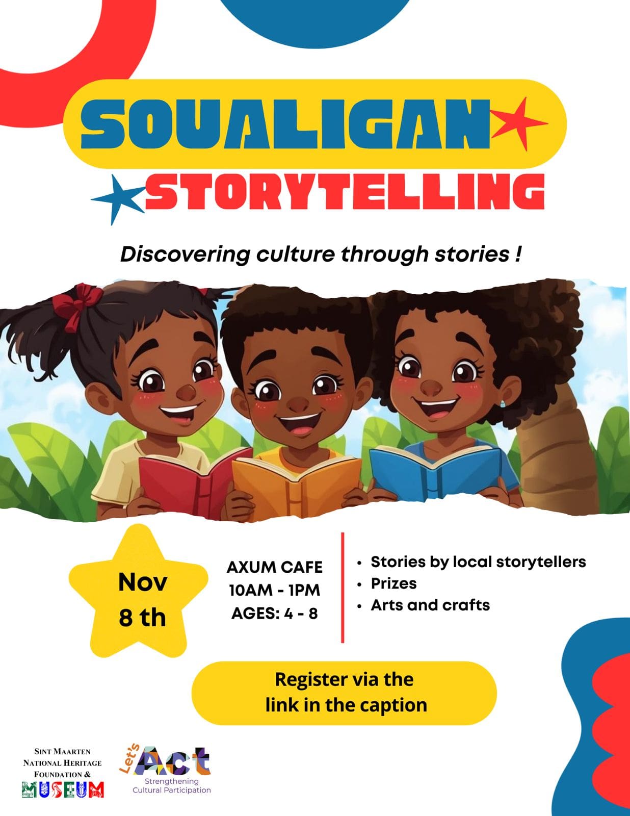 This event is for children ages 4–8, offering them a fun and engaging way to learn about St. Martin’s rich culture through the art of storytelling. There are limited spots available, so be sure to register quickly!