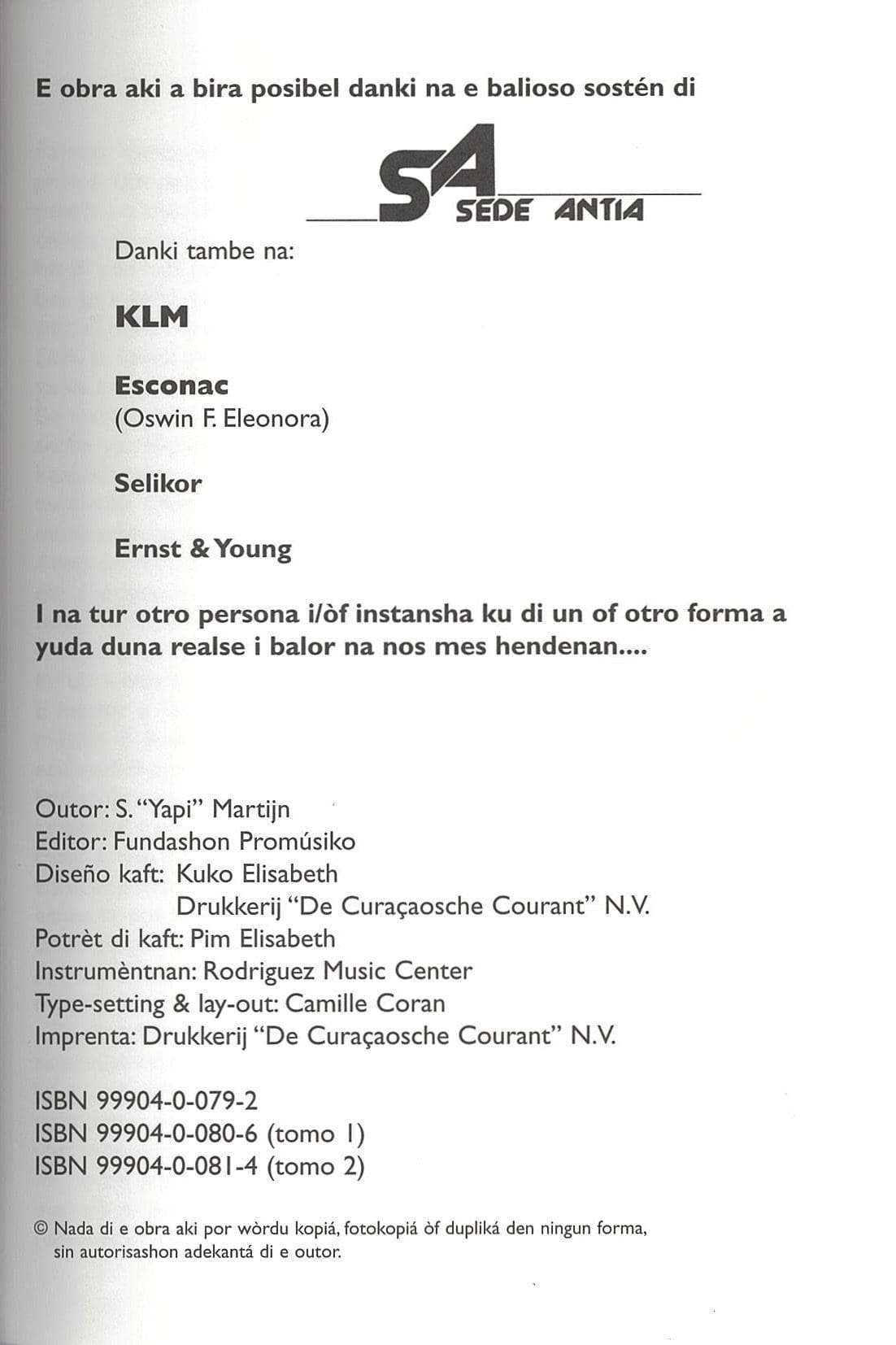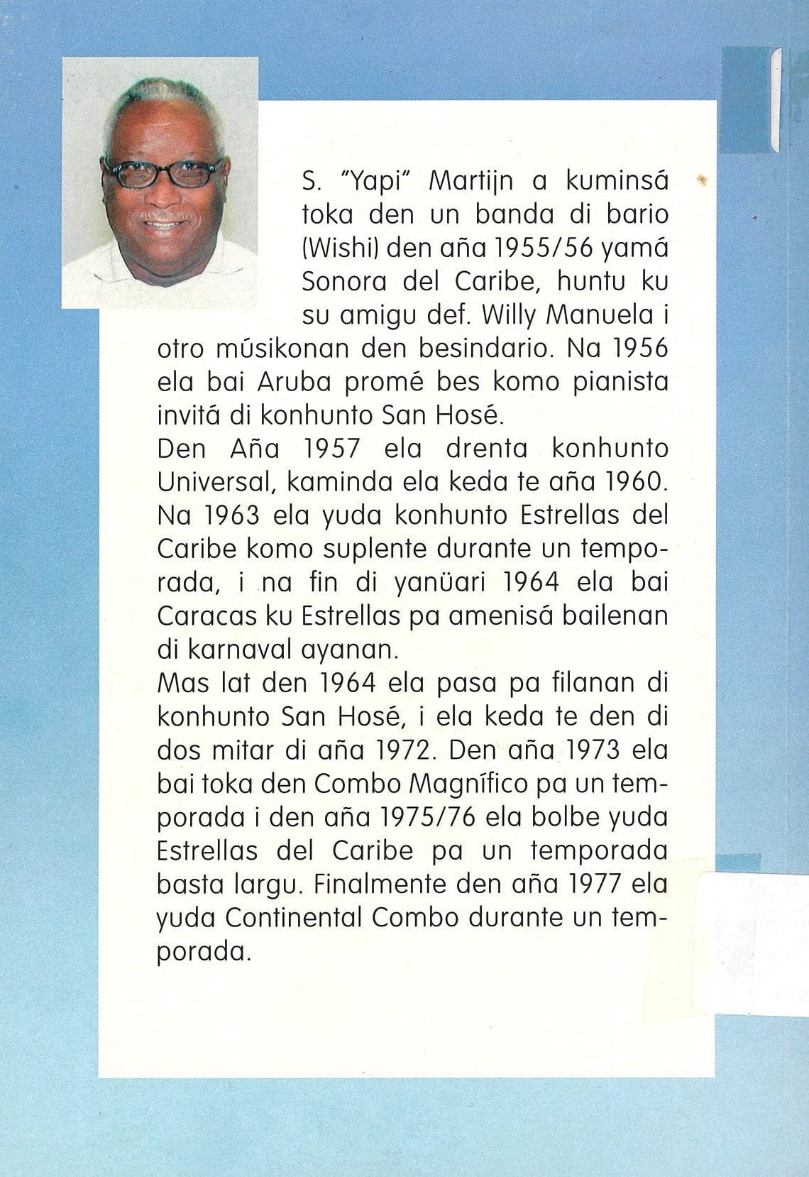 ‘Kòrsou Musikal: Un dokumentashon di nos historia musikal popular entre 1930 i 1989 (Revisá i adaptá)’, skirbí pa S. “Yapi” Martijn, ta un dokumentashon di e historia musikal popular i tradishonal di Kòrsou, ku ta ensera un deskripshon di e músikonan importante. E buki aki ta e promé tomo, ku ta deskribí dékadanan 30, 40 i 50.