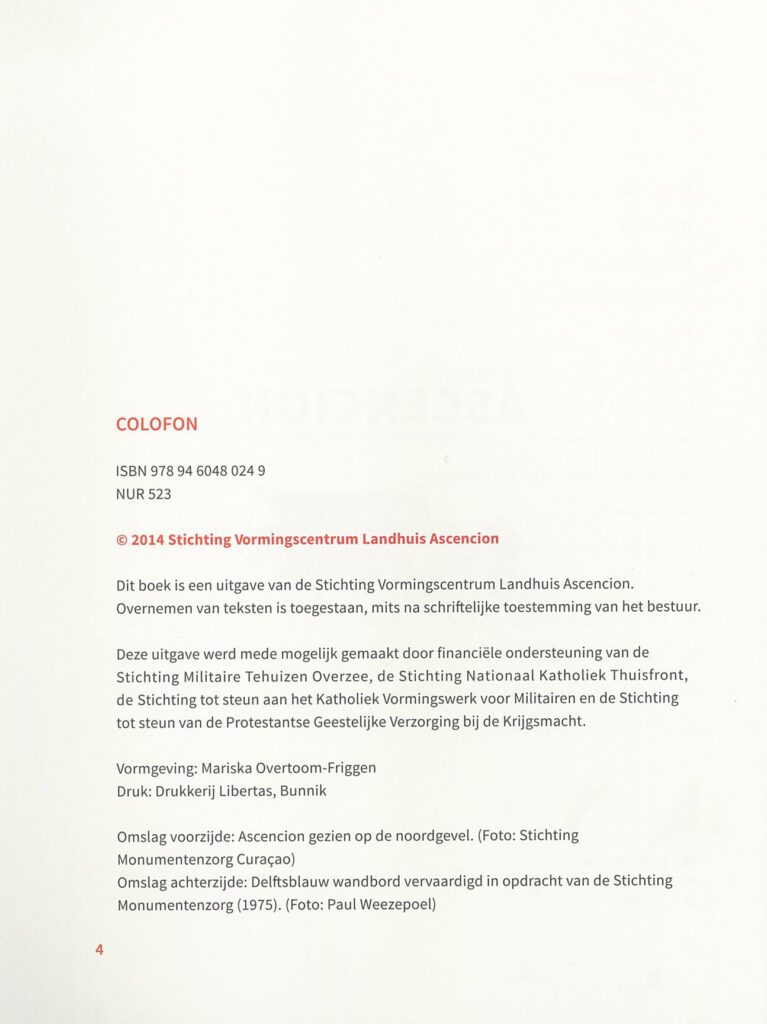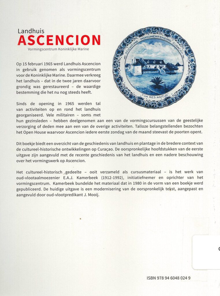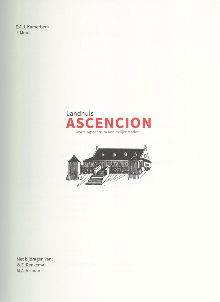 Landhuis Ascencion, oorspronkelijk gebouwd in 1672 als plantagehuis, heeft door de eeuwen heen verschillende functies vervuld. Sinds 1965 dient het als vormingscentrum voor de Koninklijke Marine, waar mariniers en andere defensiemedewerkers worden opgeleid en getraind. Het boek ‘Landhuis Ascencion: Vormingscentrum Koninklijke Marine’ is geschreven door E.A.J. Kamerbeek en J. Mooij, met bijdragen van W.E. Renkema en M.A. Visman. In 2014 werd het gepubliceerd. Dit boek biedt een uitgebreide blik op de geschiedenis en de rol van Landhuis Ascencion als vormingscentrum voor de Koninklijke Marine.