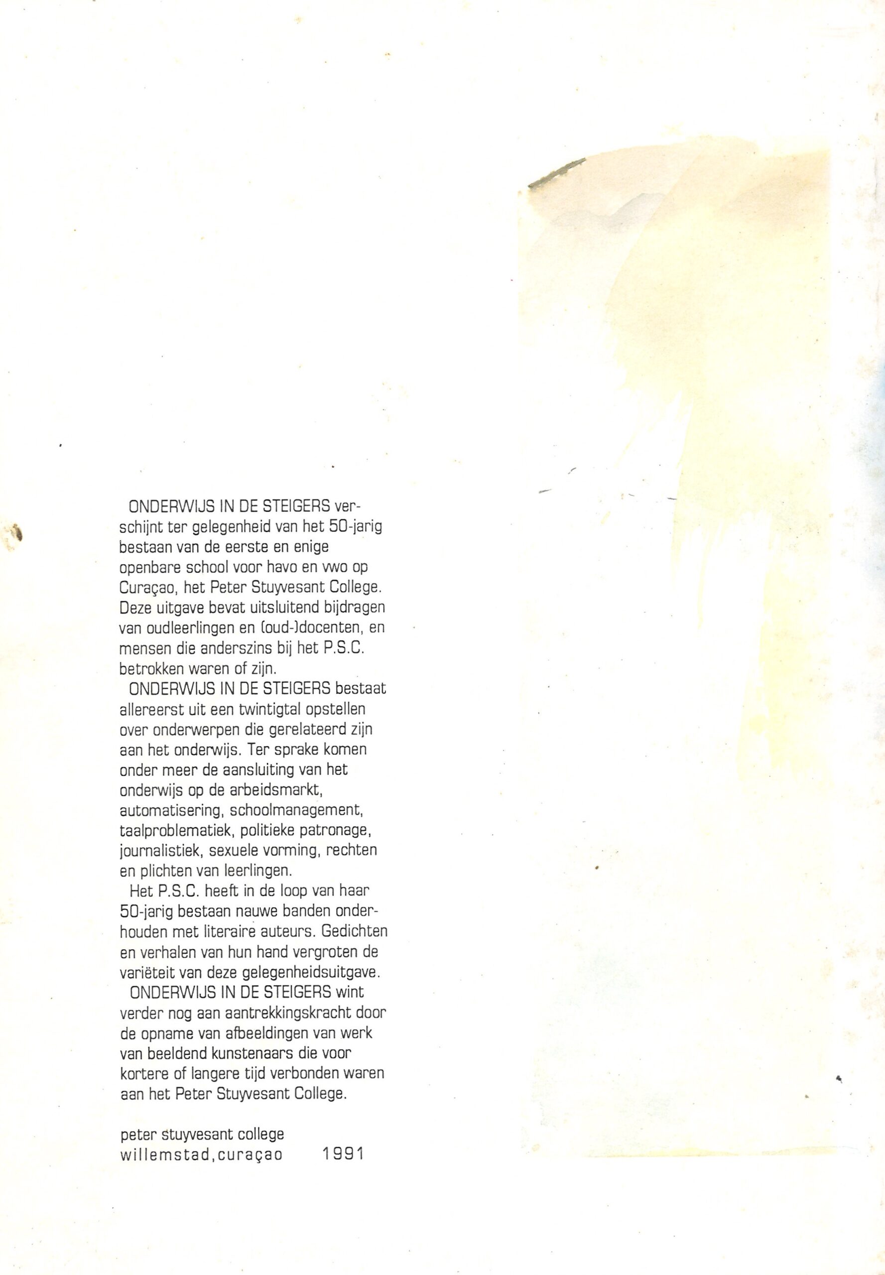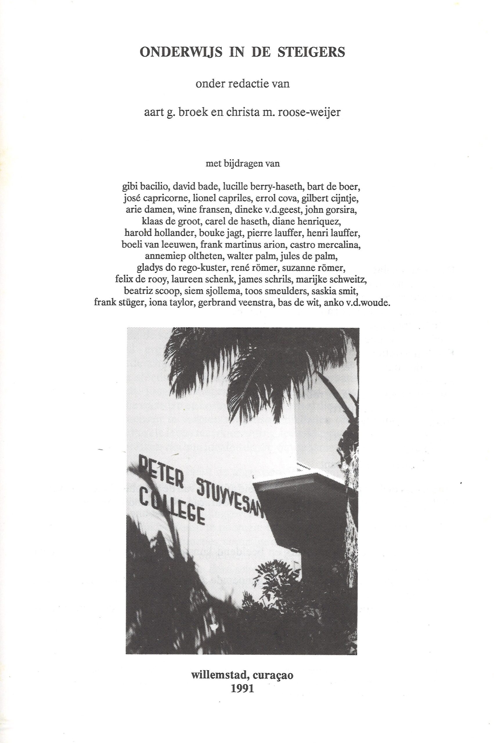 ‘Onderwijs in de steigers’ is een thematische en historische bundel die de ontwikkeling van het voortgezet onderwijs op Curaçao in kaart brengt, met bijzondere aandacht voor de rol van het Peter Stuyvesant College, tegenwoordig bekend als Kolegio Alejandro Paula (KAP). De publicatie werd samengesteld ter gelegenheid van een vernieuwingsperiode binnen het onderwijs op het eiland. De bundel bevat bijdragen van onderwijskundigen, historici en betrokkenen uit het onderwijsveld, waaronder Gibi Bacilio, Rose Mary Allen, Pierre Lauffer en anderen. Vanuit diverse perspectieven wordt het onderwijsstelsel belicht: van de koloniale wortels en de sociale functie van onderwijs tot curriculumvernieuwing en de uitdagingen van meertaligheid en culturele diversiteit binnen het klaslokaal.