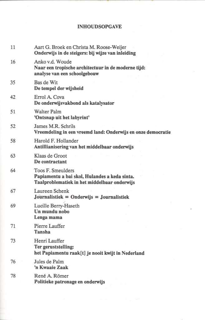 Door de combinatie van geschiedschrijving, persoonlijke reflecties en beleidsanalyses vormt het boek een waardevol naslagwerk voor wie inzicht wil krijgen in het onderwijslandschap van Curaçao aan het einde van de twintigste eeuw.