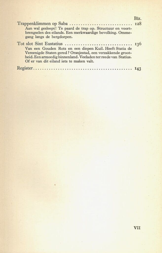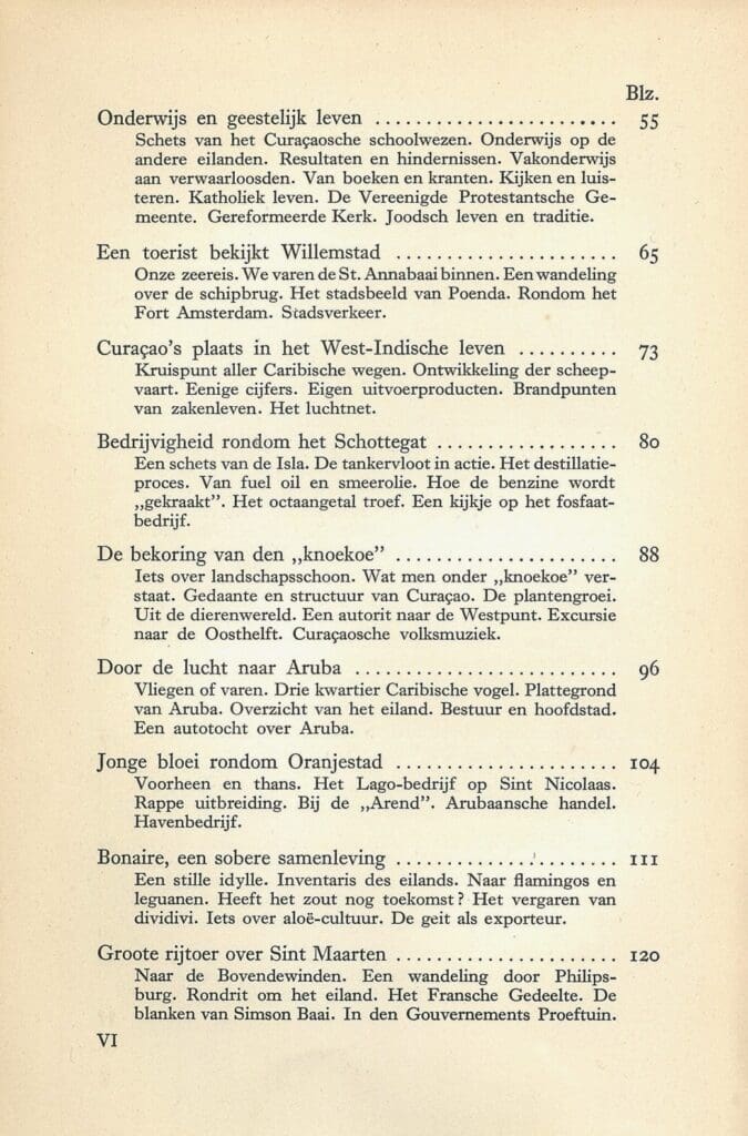 Iets over landschapsschoon. Wat men onder „knoekoe” ver-staat Gedaante en structuur van Curacao. De plantengroei. Uit de dierenwereld. Een autorit naar de Westpunt. Excursie naar de Oosthelft. Curacaosche volksmuziek.