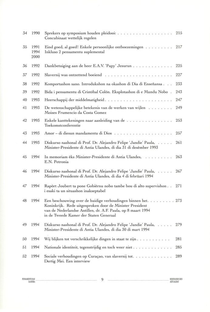 44.- 1993 – Diskurso nashonal di Prof. Dr Alejandro Felipe `Jandie’ Paula, Minister-Presidente di Antia Ulandes, di dia 31 di desember 1993 ….. 261