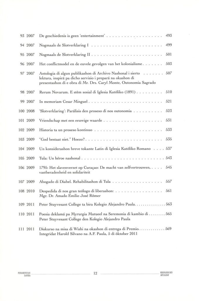 97.- 2007 – Antologia di algun publikashon di Archivo Nashonal i sierto lektura, inspirá pa dicho servisio i prepará na okashon di presentashon di e obra di Mr. Drs. Caryl Monte, Outonomia Sagrado ….. 507