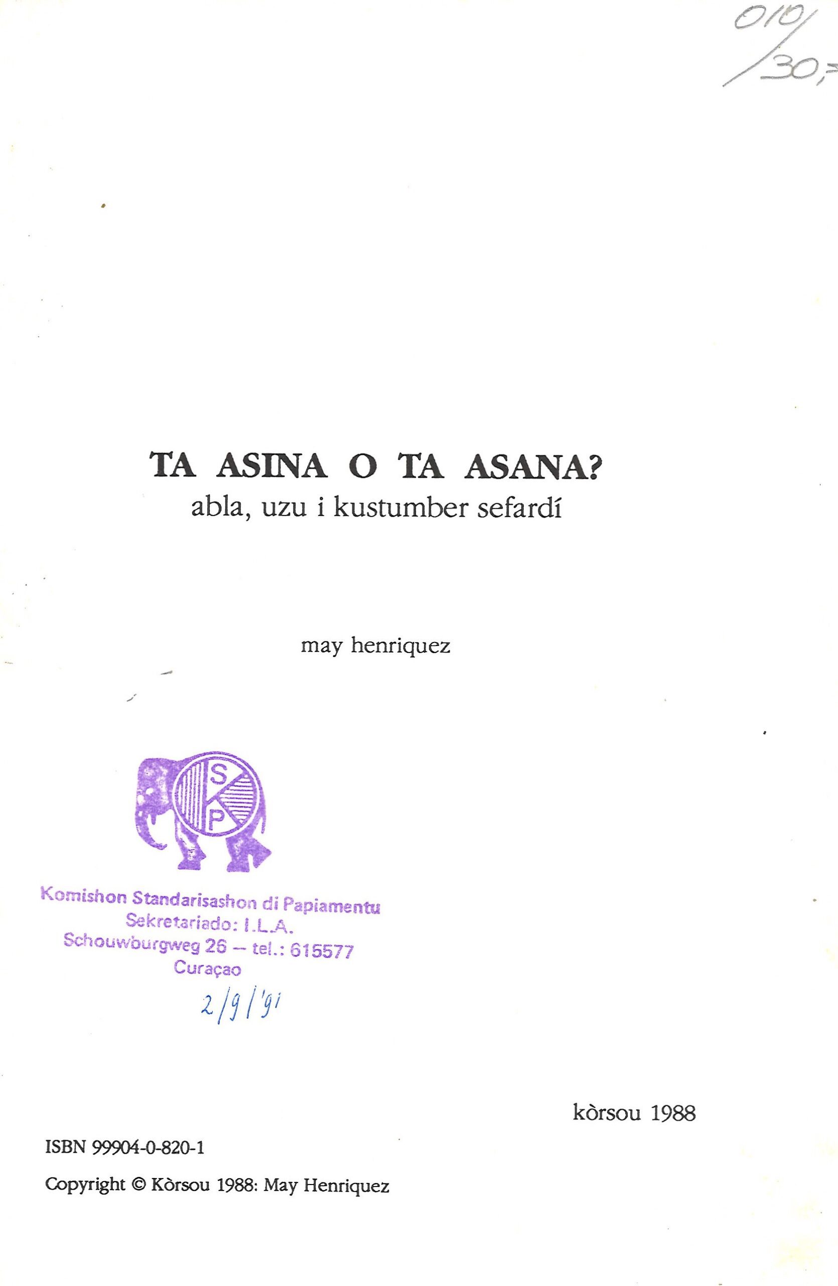 ‘Ta asina? O ta asana?’ ta un buki ku May Henriquez a skibi pa dokumentá i preservá e idioma, tradishon i manera di papia di komunidat sefardí na Kòrsou. E obra ta un kolekshon di palabra, ekspreshon, chiste i maneranan sosial di antes. Henriquez ta konta e historia ku humor i klaridat, i su intenshon ta pa si e no por kambia e futuro, al menos e por salba un parti di pasado. E buki ta un homenaje na un kulturanan ku ta disparsé poko poko.